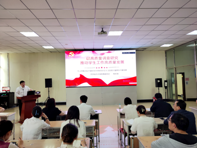 5月24日下午,校黨委副書記張文治以《以高質量調查研究推動學生工作高質量發展》為題,圍繞深刻認識調查研究作為黨的光榮傳統和優良作風形成的歷史邏輯、深刻認識“調查研究是我們黨的傳家寶、是做好各項工作的基本功”的重要政治論斷、深刻認識以高質量調查研究推動學生工作“破難題、促發展”的方法路徑等三個方面內容,深入闡釋了“如何以高質量調查研究推動學生工作高質量發展”這個問題。強調廣大學生工作干部要在實踐中進一步找準黨的二十大決策部署與本職工作的主要關聯點,在推動齊齊哈爾大學在參與高等教育合作競爭中,走在前列、爭做表率。要堅持利用好調查研究這個我們黨的“傳家寶”,在實現“破難題、促發展”中推動學生工作實現高質量發展。