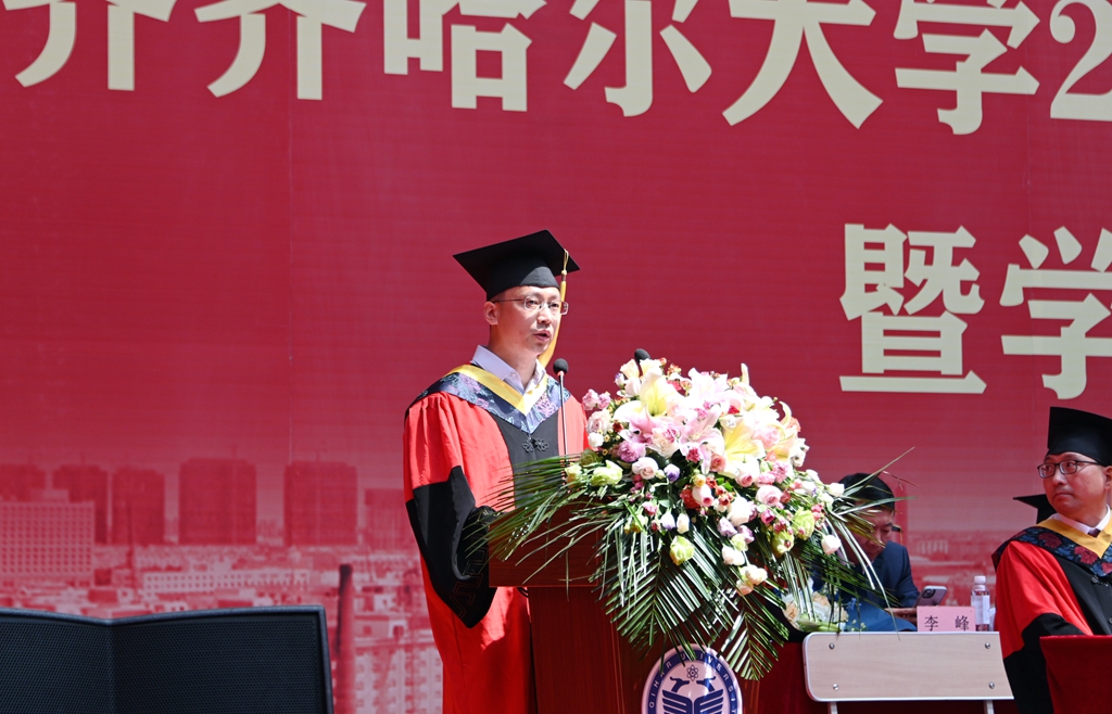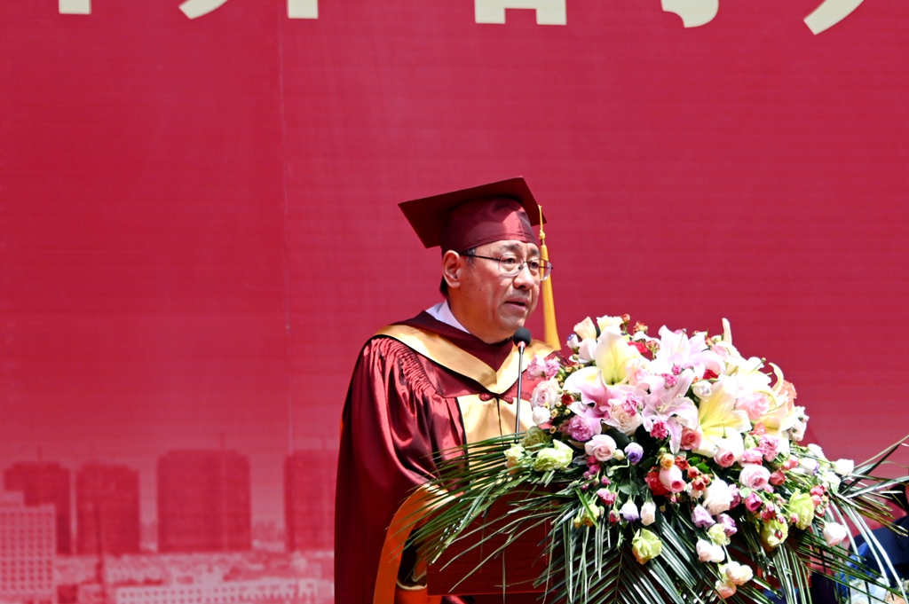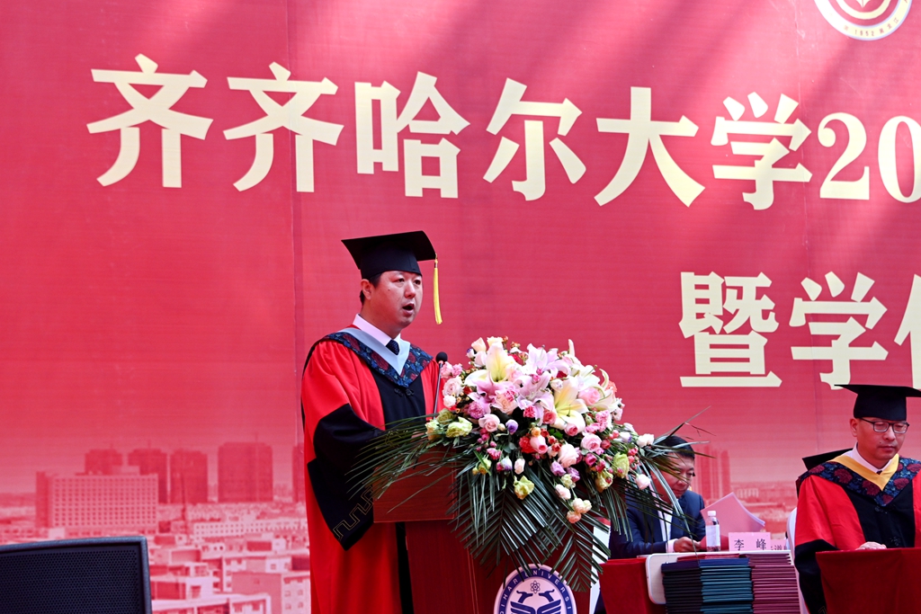 他說,“畢業”既標志著一段學習經歷的完結,也標志著人生新的征程的開啟。回首往昔,你們在齊大度過了一段極不平凡的青春歲月,在美麗的環湖大學,度過了最美的青春時光。特別是你們在學校,學習生活期間,克服了疫情影響,圓滿完成了學業,以各方面的優異表現,交上了一份完美的畢業答卷。你們彰顯著齊大學子的家國情懷和赤子之心,傳遞了齊大正能量和好聲音。母校為你們點贊,向你們致敬!作為校長,我為大家圓滿完成學業感到由衷地高興,更對同學們的美好未來充滿著期待!臨別之際,我對同學們提出四點希望和囑托:一是希望你們樹立遠大理想,堅定信仰信念;二是希望你們心懷“國之大者”,擔當時代責任;三是希望你們堅持吃苦耐勞,始終砥身礪行;四是希望你們保持永久奮斗,投身強國偉業。