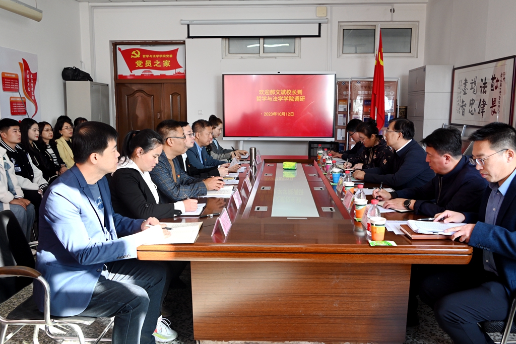 10月12日上午,校長郝文斌在相關部門負責人陪同下,深入哲學與法學學院調研指導學院建設相關工作,征集學院干部師生對學校建設、改革與發展的意見和建議。