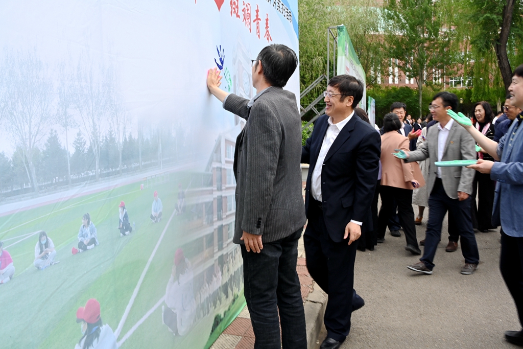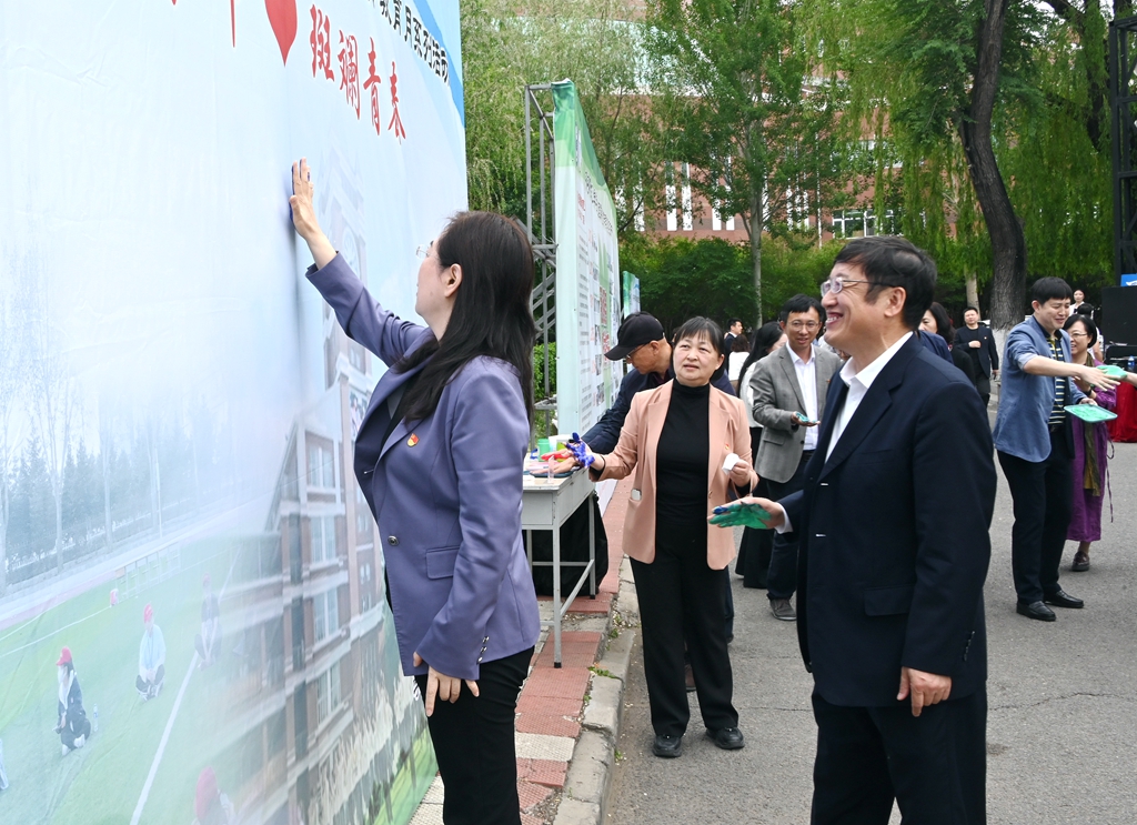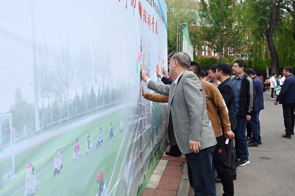 活動(dòng)開始前,現(xiàn)場(chǎng)的領(lǐng)導(dǎo)、老師和同學(xué)們?cè)凇拔宀适钟。邤糖啻骸敝黝}展板上留下心靈印記,描繪青春夢(mèng)想和希望,簽名記錄美好時(shí)光。
