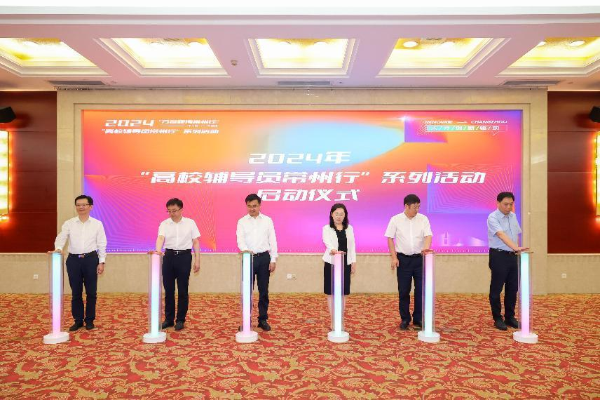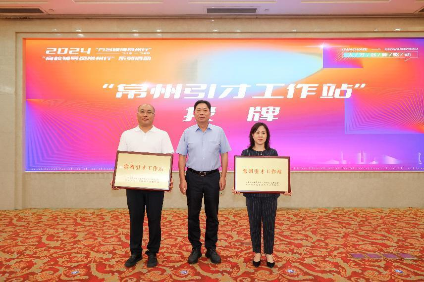 啟動儀式上,常州市人力資源和社會保障局黨組書記、局長王竹林向我校授予“常州引才工作站”牌,與會領導一同點亮按鍵,正式啟動2024年“高校輔導員常州行”系列活動。