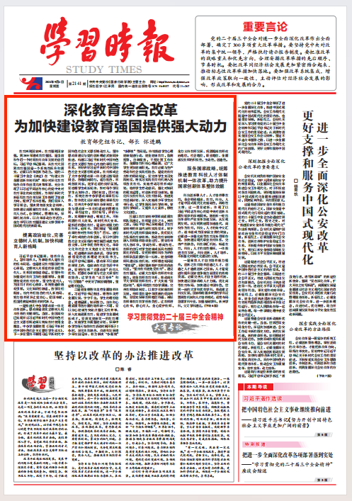 教育興則國家興,教育強則國家強。到2035年建成教育強國,是當前和今后一個時期教育改革發展的總目標。習近平總書記強調,從教育大國到教育強國是一個系統性躍升和質變,必須以改革創新為動力。黨的二十屆三中全會《決定》在“構建支持全面創新體制機制”部分對深化教育綜合改革作出重大決策部署,充分體現了以習近平同志為核心的黨中央對教育事業的高度重視,為做好新時代新征程教育改革發展工作指明了前進方向、提供了根本遵循。我們要深入學習領會、堅決貫徹落實全會精神,加快建設高質量教育體系,統籌推進育人方式、辦學模式、管理體制、保障機制改革,以改革添動力增活力,奮力書寫以教育強國建設支撐引領中國式現代化的新篇章。