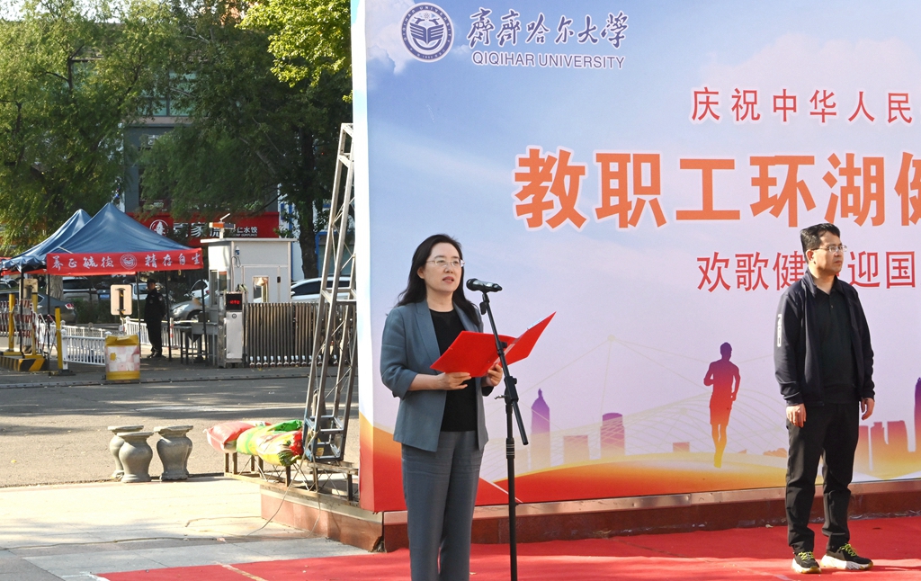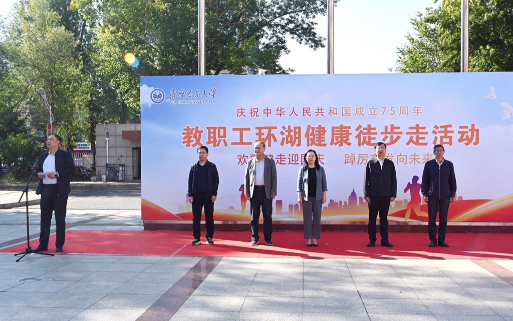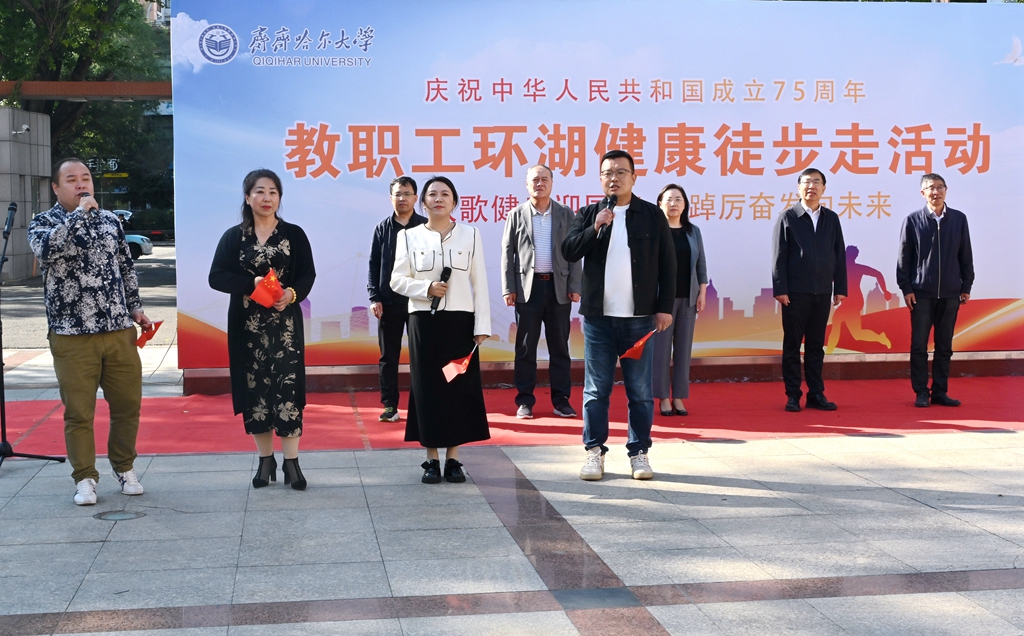 校黨委書記丁宏在致辭時指出,75年來,在中國共產黨的領導下,全國各族人民團結一心、同舟共濟,戰勝了無數艱難險阻,實現了從站起來、富起來到強起來的歷史性飛躍,中國特色社會主義進入新時代。有著72年辦學歷史的齊齊哈爾大學坐落于勞動湖畔,素有“環湖大學”的美譽,這一池碧水見證了學校的發展和變遷,也為巍巍學府增添了無限的秀美與靈氣。教職工環湖健康徒步走是我校傳統特色體育活動,深受教職工的歡迎。希望廣大教職工在此次健步走活動中,欣賞勞動湖畔秋日的美景,感受健康運動帶來的身心愉悅,在集體活動中增強凝聚力,在攜手并肩前行中增進團結,進一步激發愛校榮校、愛崗敬業、攻堅奮進的精神動力,爭做學校高質量發展的參與者、推動者、宣傳者。