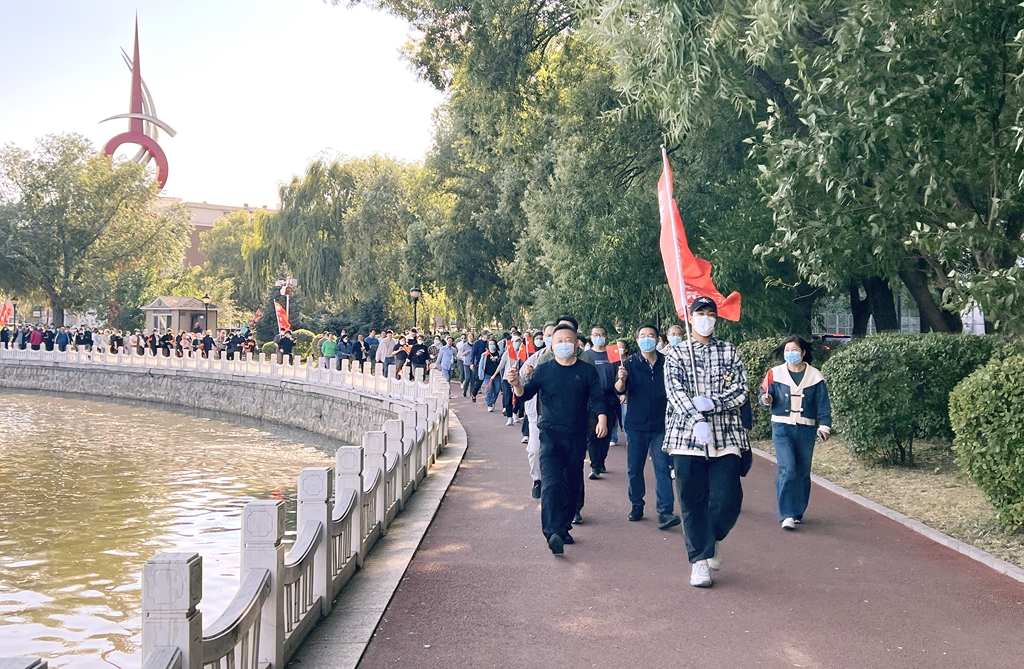 來自全校25個基層工會的一千余名會員代表參加活動,伴隨著發令槍聲,各基層工會依次來到勞動湖科技之光廣場列隊出發。環湖甬道上旗幟飄揚、人影攢動、身姿矯健,大家在沿途的地標性建筑前打卡、拍照,齊齊哈爾大學教職工環湖健康徒步走活動成為秋日勞動湖畔一道亮麗的風景線。