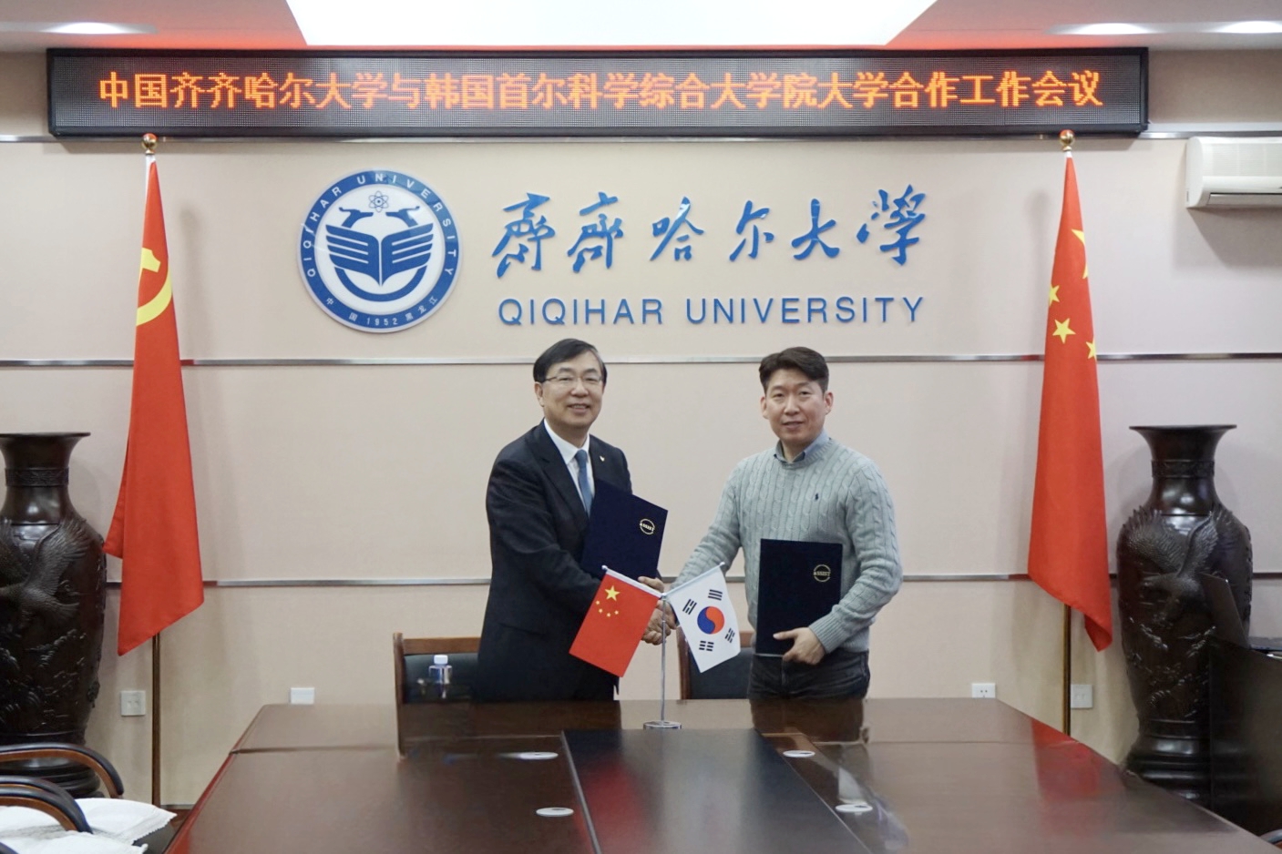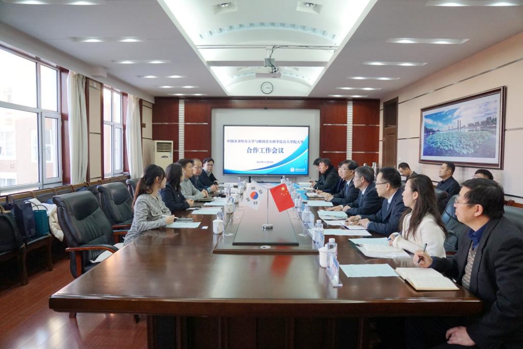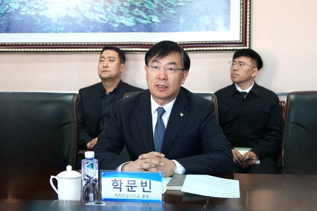 郝文斌期望此次交流會議能夠成為加強兩校合作的重要契機,并對下一步重點合作領域提出建議:一是加強校際學生交流,促進互學互鑒。開展碩士短期交流項目、冬夏令營研學項目等,增進學生間的互動與理解,為推動區域內國家之間的友好合作作出積極貢獻。二是開展碩士、博士項目,貫通本碩博人才培養通道。通過開展碩士雙學位項目、博士項目,貫通碩博人才培養通道,推動對韓合作形成機制化、常態化人才培養體系。三是深化學術交流,實現優勢學科互補。依托雙方優勢學科資源,兩校專家學者深化交流合作,共同推動科研創新與學科建設。四是舉辦中外合作辦學項目,推動兩校合作向高水平發展。在兩校已有合作基礎上,適時啟動碩士層面中外合作辦學項目申報,培養高水平國際化復合型人才,推動兩校合作向高水平發展。五是搭建文化交流平臺,增進文明交流互鑒。齊齊哈爾大學歷史文化底蘊深厚、特色優勢鮮明、充滿發展潛力,通過兩校多領域交流合作,促進彼此相互了解,深化友誼,增進文化認同與尊重,促進中韓兩國世代友好。