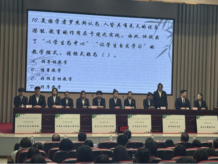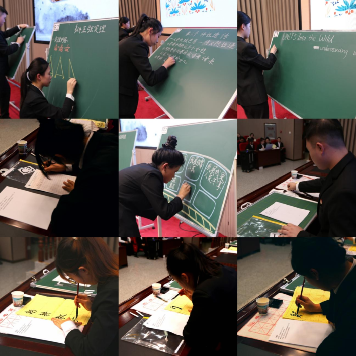 決賽分為個人三筆字書寫、板書設計、說課與講課技能比賽,學院團體知識競答兩個部分。經過角逐,理學院賈國瑩獲一等獎,馬克思主義學院韓彤獲二等獎,化學與化學工程學院徐陽陽獲三等獎,其余6名同學獲優秀獎;教師教育學院獲團體一等獎,美術與藝術設計學院獲團體二等獎,化學與化學工程學院獲團體三等獎,馬克思主義學院、計算機與控制工程學院、音樂與舞蹈學院獲團體優秀獎,9名指導教師獲“優秀指導教師”獎。