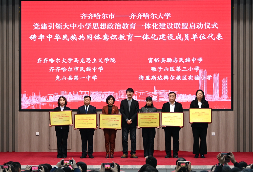 與會(huì)領(lǐng)導(dǎo)分別為“齊齊哈爾市—齊齊哈爾大學(xué)黨建引領(lǐng)大中小學(xué)思想政治教育一體化建設(shè)聯(lián)盟”成員單位代表授牌。