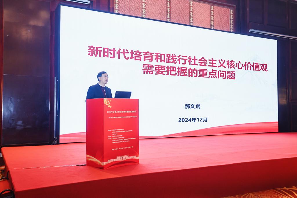 我校校長郝文斌教授受邀參會并作主旨報告。他以《新時代培育和踐行社會主義核心價值觀的重要問題》為主題,從深刻把握習(xí)近平總書記關(guān)于培育和踐行社會主義核心價值觀的重要論述,新時代培育和踐行社會主義核心價值觀的重要性緊迫性、重點(diǎn)場域、關(guān)鍵性問題和實(shí)踐路徑等五個方面闡述了觀點(diǎn)和見解。郝文斌還參加了會議分論壇,同與會學(xué)者進(jìn)行深入研討、廣泛交流,共同探討社會主義核心價值觀建設(shè)常態(tài)化制度化等理論和實(shí)踐問題。
