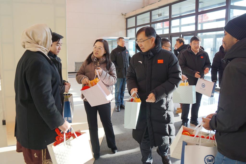 喜慶的中國(guó)結(jié)、火紅的燈籠,“中國(guó)紅”讓德潤(rùn)大廈內(nèi)暖意融融、喜氣洋洋。校領(lǐng)導(dǎo)一行看望在校留學(xué)生并送上紀(jì)念品,讓同學(xué)們感受來自中國(guó)傳統(tǒng)新年的熱情與祝福。校領(lǐng)導(dǎo)表示,春節(jié)是中國(guó)最重要的傳統(tǒng)節(jié)日,是中國(guó)人闔家團(tuán)圓的時(shí)刻,每一位留學(xué)生都是齊大大家庭的一員,在這個(gè)特殊的日子里,希望同學(xué)們?cè)邶R大校園里能感受到“家”的溫暖,祝愿大家新春快樂,巳巳如意,蛇年吉祥!