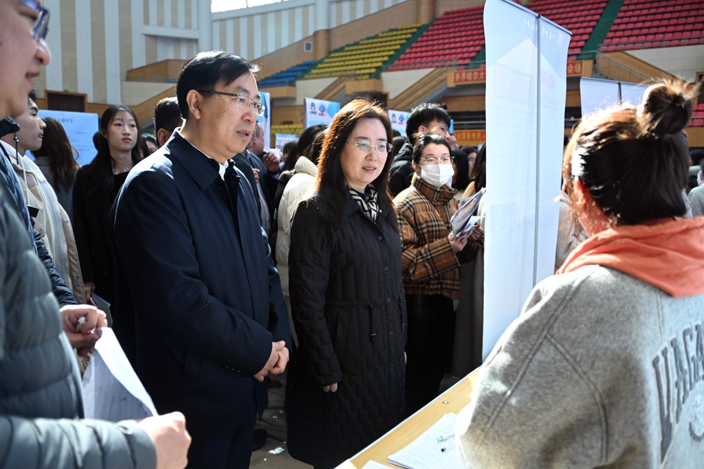 校黨委書記丁宏,校長、黨委副書記郝文斌等學校領導班子成員深入雙選會現場走訪交流,與寧波市寧海縣人社局、山東省淄博市人社局等政府部門負責人共商人才引育機制,同泗陽桃州中學、大連市育才高級中學、特變電工山東魯能電纜有限公司、正大天晴藥業集團股份有限公司等重點用人單位代表探討產教融合新路徑,結合學科特色精準對接企業需求,并向求職學生詳細了解職業規劃與就業難點,現場為畢業生提供崗位匹配建議,構建起“政校企生”四方協同的就業服務生態。