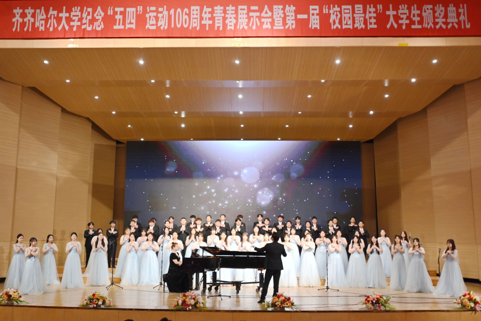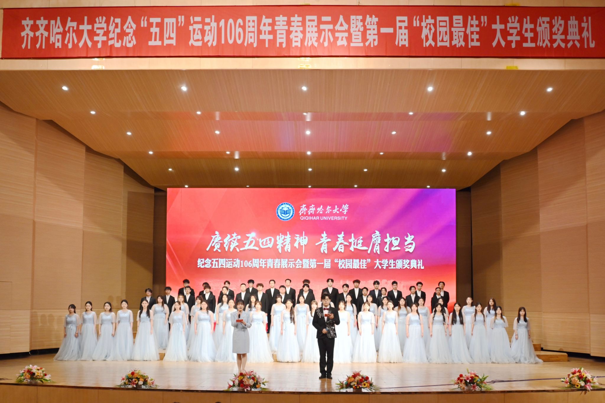 4月28日晚,學(xué)校紀(jì)念五四運(yùn)動(dòng)106周年青春展示會(huì)暨第一屆“校園最佳”大學(xué)生頒獎(jiǎng)典禮在音樂(lè)廳舉行?;顒?dòng)以“賡續(xù)五四精神禮贊青春榜樣”為主題,通過(guò)表彰在思想道德、專業(yè)學(xué)習(xí)、科技創(chuàng)新等領(lǐng)域表現(xiàn)突出的優(yōu)秀學(xué)子,激勵(lì)廣大青年傳承五四精神,勇?lián)鷷r(shí)代使命。校領(lǐng)導(dǎo)和師生代表4000余人線上線下參加活動(dòng)。