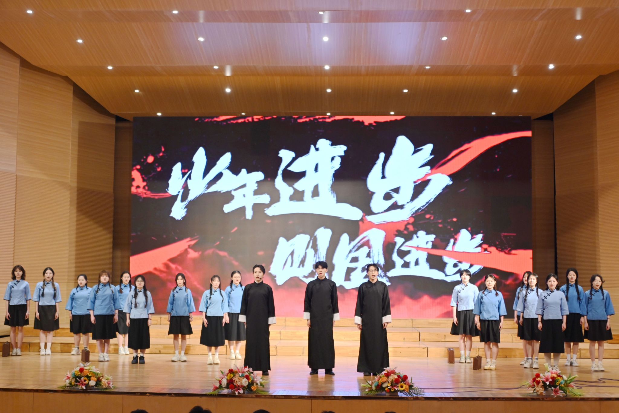 本場(chǎng)活動(dòng)共分三個(gè)單元。在“傳承·薪火——致敬百年五四精神”單元中,校舞蹈團(tuán)的同學(xué)們以舞蹈《烈火中永生》拉開(kāi)序幕,通過(guò)藝術(shù)形式再現(xiàn)革命先輩的奮斗精神,現(xiàn)場(chǎng)觀眾在光影交錯(cuò)中感受五四精神的薪火相傳。校青年宣講團(tuán)的同學(xué)們以音詩(shī)畫(huà)表演《如愿》,帶領(lǐng)觀眾穿越時(shí)空,感受歷史與青春的碰撞,見(jiàn)證夢(mèng)想與奮斗的交融,展現(xiàn)出齊大學(xué)子傳承五四薪火的生動(dòng)圖景。