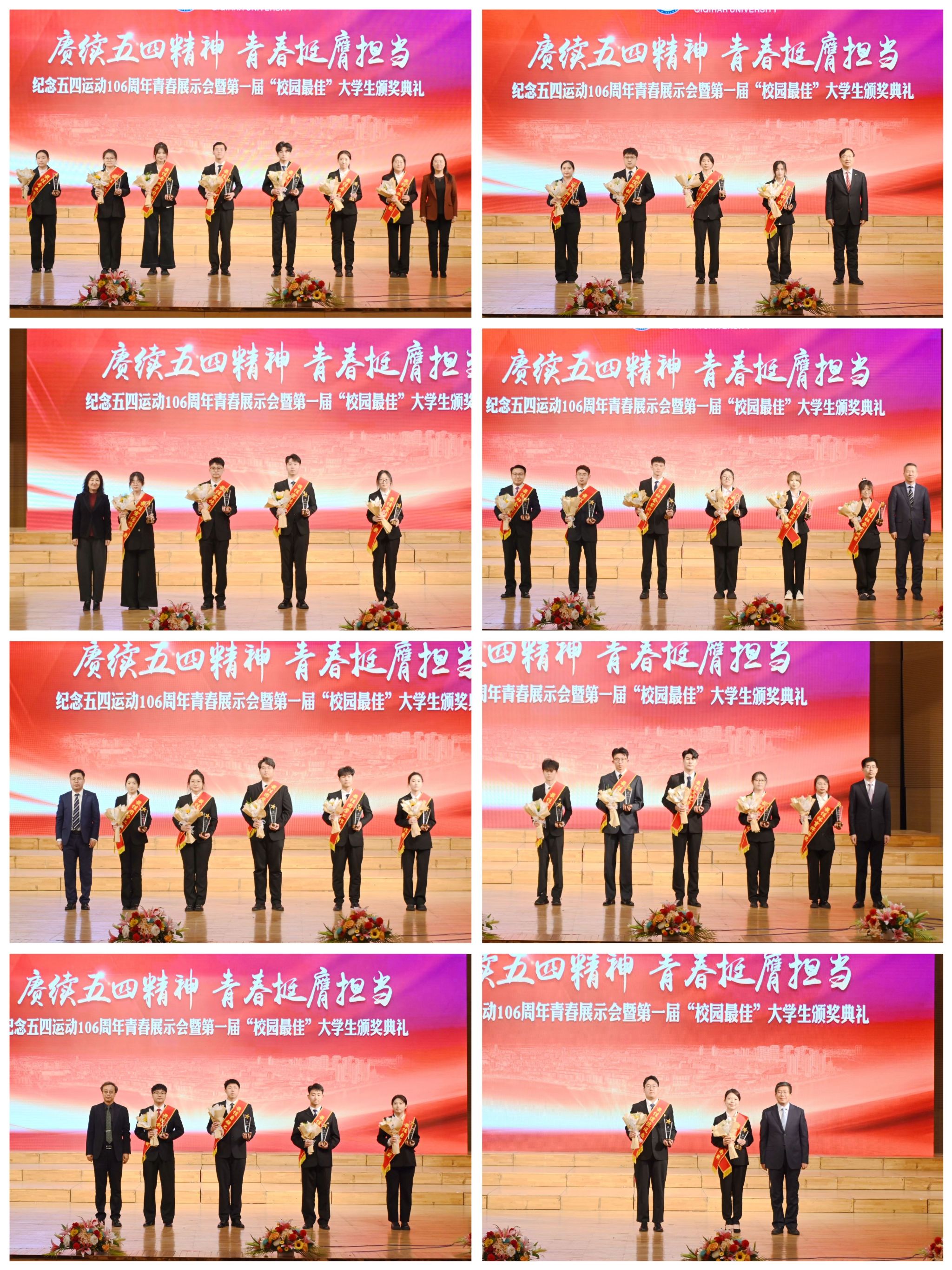 在“奮斗·青春——禮贊齊大榜樣力量”單元中,活動(dòng)現(xiàn)場(chǎng)揭曉了第一屆“校園最佳”大學(xué)生獎(jiǎng)項(xiàng),校領(lǐng)導(dǎo)分別為41名獲獎(jiǎng)學(xué)子頒發(fā)獎(jiǎng)杯和鮮花,表彰他們?cè)诘赖嘛L(fēng)尚、自強(qiáng)不息、專業(yè)學(xué)習(xí)、科技創(chuàng)新、體育拼搏、社會(huì)實(shí)踐、文藝貢獻(xiàn)、宣傳推廣、團(tuán)學(xué)工作、創(chuàng)業(yè)實(shí)踐等十個(gè)領(lǐng)域的優(yōu)秀表現(xiàn)。