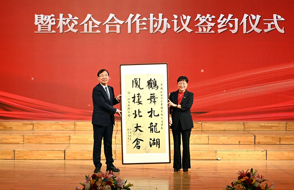 郝文斌代表學校向北大倉集團贈送了我校張充呂教授題寫的墨寶“鶴舞扎龍湖,鳳棲北大倉”。
