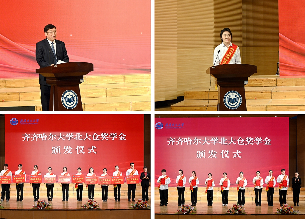 儀式在舞蹈《永遠的紅飄帶》中拉開帷幕,張文治宣讀了《關于命名表彰2023-2024學年北大倉獎學金獲得者的決定》,隋熙鳳、李南希分別為獲獎學生代表頒發了北大倉獎學金及證書,郭芮汐同學代表獲獎學生進行了發言。
