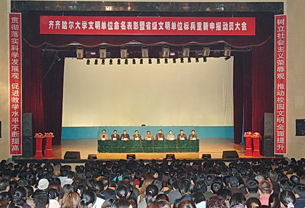 為了深入貫徹落實中央、省、市關于精神文明建設的意見和要求,貫徹落實學校《“十一五”文明單位建設規劃》,進一步提高我校文明單位建設的層次和水平,我校于4月12日下午在中區文化宮隆重召開了齊齊哈爾大學文明單位命名表彰暨創建省級文明單位標兵動員大會。