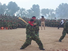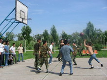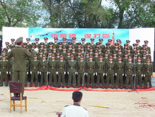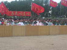 下午1點10分,五輛軍用汽車來到學校將學院領導、老師及院學生會、鄧研會、團委的學生干部和表演人員150人接到了部隊的駐地。在部隊引導員的帶領下首先參觀了軍隊內務,干凈整潔的宿舍令同學嘖嘖稱贊,優良的作風使學生受益非淺。同學們接著又觀看了戰士軍事訓練科目對抗表演,干凈利索的動作、無所畏懼的精神,使同學們真正懂得了什么是共和國的軍人。參觀后,由學生會、鄧研會、院團委干部組成的“強之隊”與戰士們組成的“勇之隊”進行了一場籃球友誼賽,即交流了球技,又增進了友誼。
