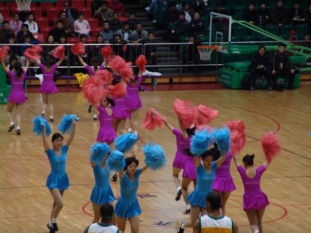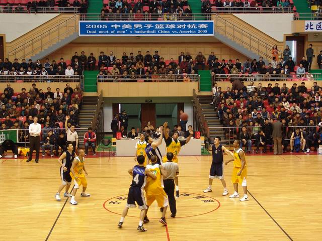 4月24日15時, 2005中美男子籃球?qū)官愒谖倚sw育館拉開戰(zhàn)幕。我市和我校有關(guān)領(lǐng)導(dǎo)及我校部分師生、鶴城各界群眾千余人在我校規(guī)模宏大、設(shè)施完備、設(shè)備先進的體育館現(xiàn)場觀看了比賽盛況。