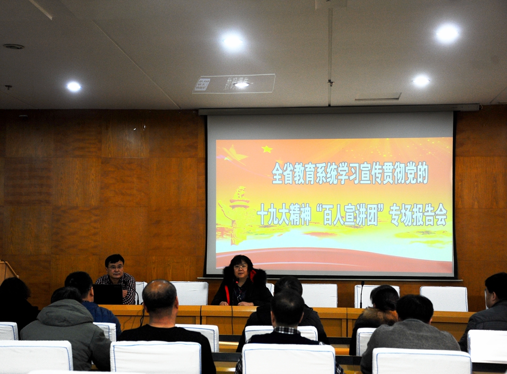 12月26日下午,全省教育系統學習宣傳貫徹黨的十九大精神“百人宣講團”報告會在我校西區主樓七樓學術報告廳舉辦,學校黨委邀請全省教育系統學習宣傳貫徹黨的十九大精神“百人宣講團”成員、我校馬克思主義學院馬克思主義基本原理教研部主任王圣禎教授作黨的十九大精神輔導報告。學生工作部(學生處)、校團委、就業指導處全體工作人員,各學院主管學生工作的黨委書記、副書記副院長、全體輔導員以及我校第五期團學骨干日新班學員參加了報告會。會議由校黨委宣傳統戰部部長王曉梅主持。