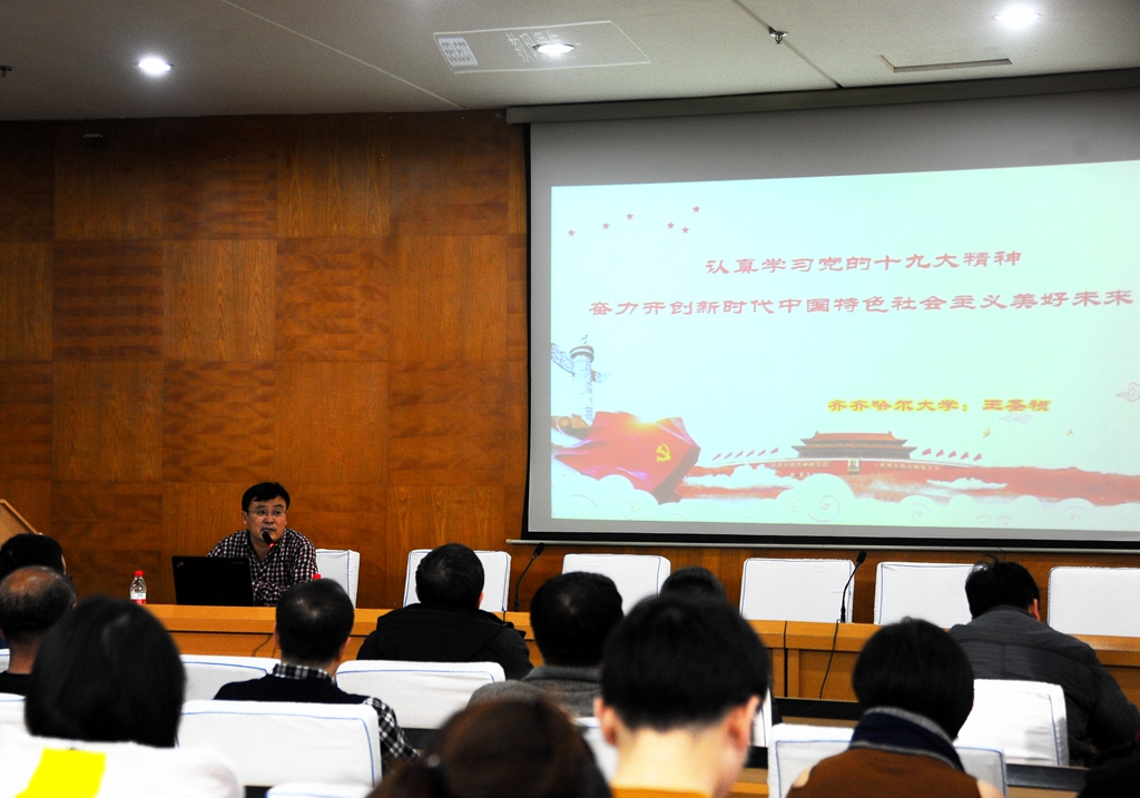 會上,王圣禎教授以《奮力開創新時代中國特色社會主義美好未來》為題,從黨的十九大主題和主要成果、中國特色社會主義進入新時代、新時代中國特色社會主義的主要矛盾、新時代中國特色社會主義的歷史使命、新時代中國特色社會主義的理論指導、新時代中國特色社會主義的戰略目標、新時代中國特色社會主義的戰略部署、新時代中國特色社會主義的堅強領導等八個方面,對黨的十九大精神進行了系統解讀。