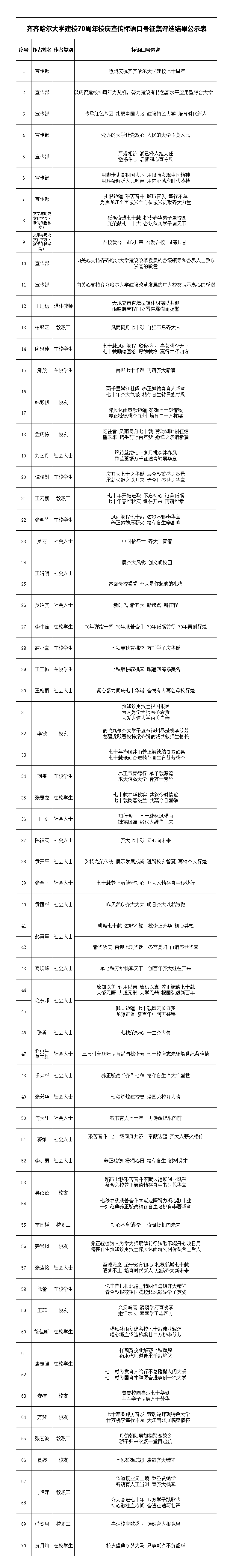 為喜迎齊齊哈爾大學(xué)建校70周年,弘揚(yáng)“養(yǎng)正毓德 精存自生”的校訓(xùn)精神,深刻熔煉學(xué)校的辦學(xué)理念、歷史文化、優(yōu)良傳統(tǒng)、精神品格、成就特色,鼓舞激勵(lì)全校師生繼承傳統(tǒng),開(kāi)創(chuàng)未來(lái),學(xué)校于2022年3月16日正式向校內(nèi)外發(fā)布了《齊齊哈爾大學(xué)關(guān)于征集建校70周年校慶宣傳標(biāo)語(yǔ)口號(hào)的通知》。截至2022年4月16日,收到在校學(xué)生、在校教職工、離退休教職工、校友、社會(huì)人士145人的投稿,共征集到原創(chuàng)的宣傳標(biāo)語(yǔ)口號(hào)投稿823條。學(xué)校進(jìn)行了認(rèn)真的整理,成立校慶宣傳標(biāo)語(yǔ)口號(hào)評(píng)審小組,進(jìn)行了匿名評(píng)審,共評(píng)選出具有鮮明齊大特色、含義深刻、振奮精神、鼓舞人心的入圍宣傳標(biāo)語(yǔ)口號(hào)70條。具體內(nèi)容如下: