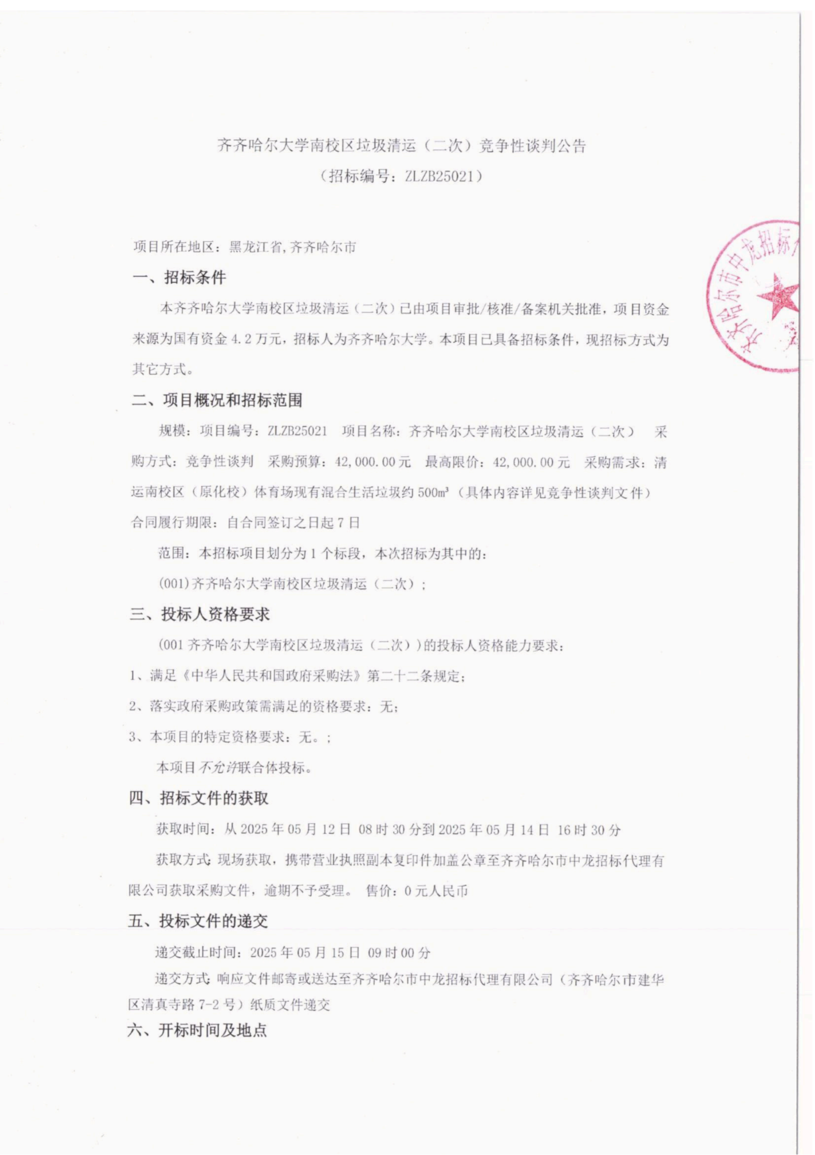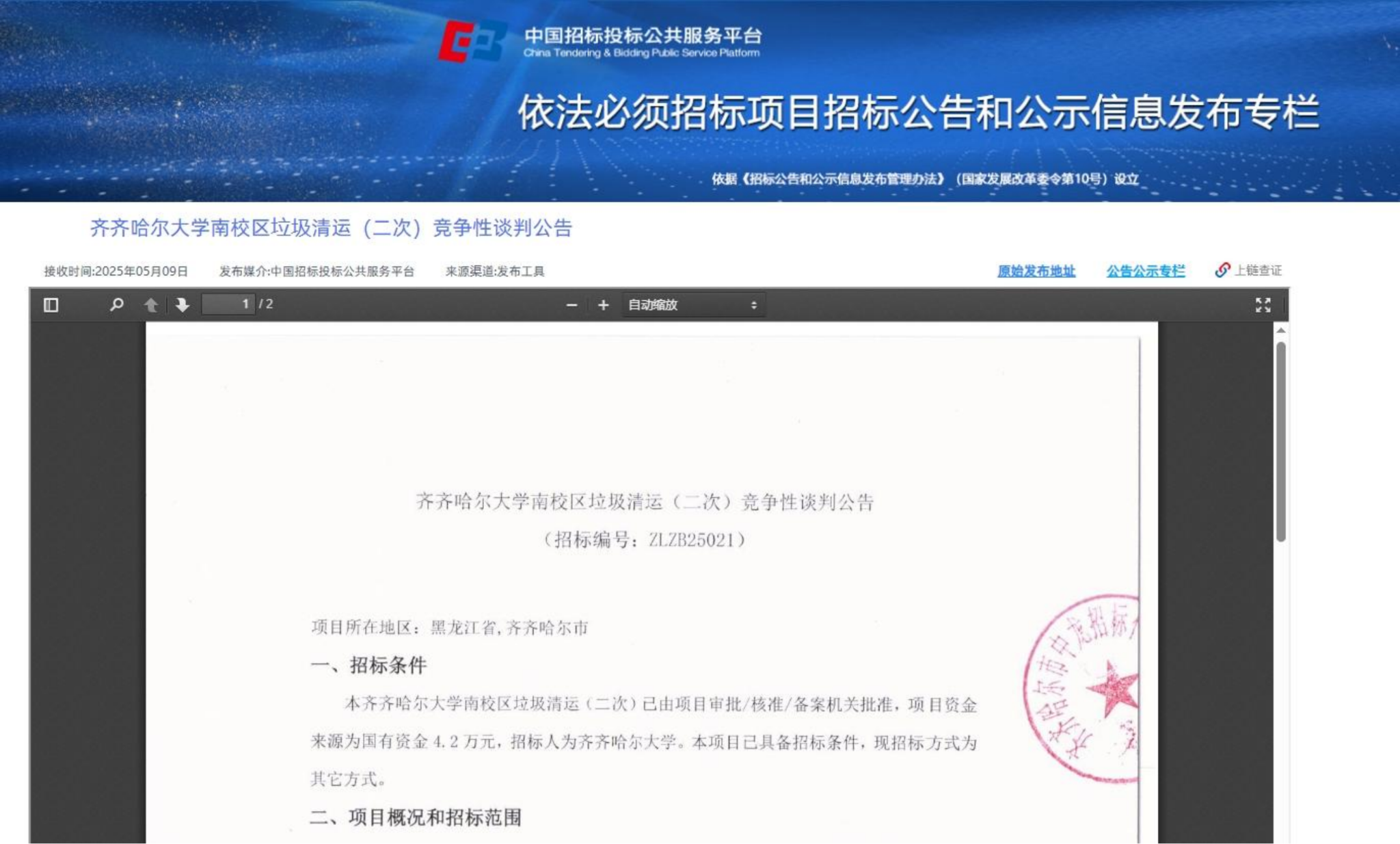 上一條:齊齊哈爾大學南校區垃圾清運流標公告(轉自中國招標投標公共服務平臺)