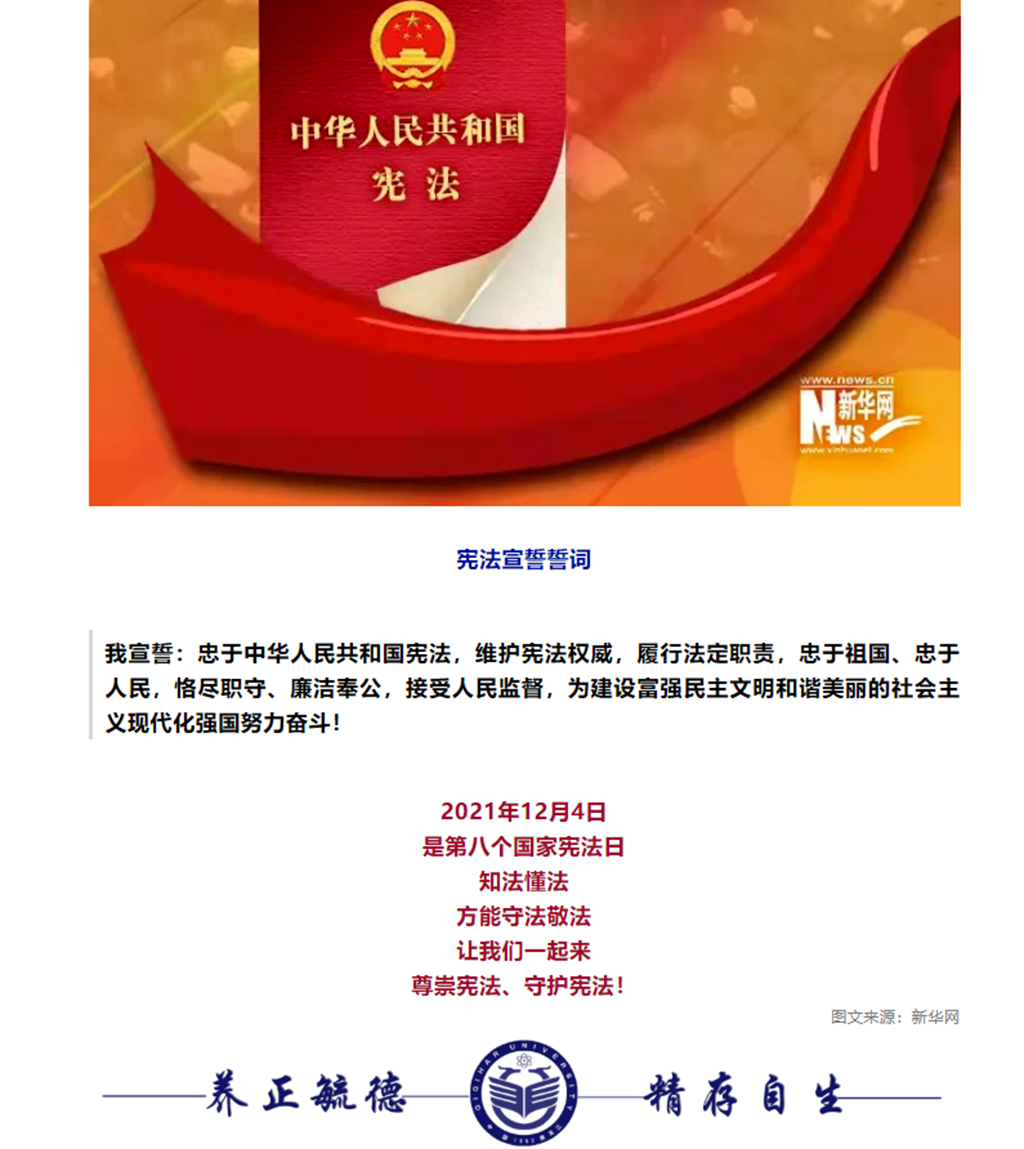 2021年,在校黨委統(tǒng)籌部署、校普法工作領導小組周密安排和各黨委、直屬黨支部的積極參與下,我校圍繞“以習近平法治思想為指引堅定不移走中國特色社會主義法治道路”的主題,以第八個“國家憲法日”、第四個“憲法宣傳周”為契機,深入貫徹落實“八五”普法規(guī)劃,開展了一系列豐富多彩的法治宣傳教育活動,弘揚憲法精神,筑法治之基,行法治之力,積法治之勢,進一步推動師生樹立憲法意識和法治觀念,營造了學法知法懂法用法的濃厚法治氛圍。
