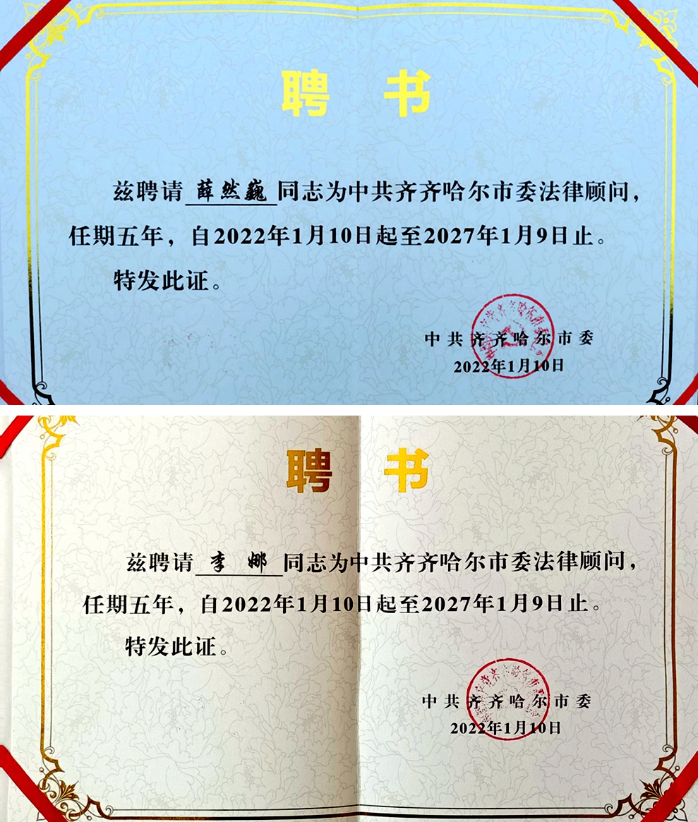 日前,中共齊齊哈爾市委辦公室發布了齊齊哈爾市委法律顧問調整推薦通知,我校組織部選拔推薦了市委法律顧問及法律專家庫名單。經過市委嚴格論證、審查、考核,我校薛然巍副教授和李娜副教授兩名教師受聘為市委法律顧問,李主峰、唐世齊入選市委法律專家庫。