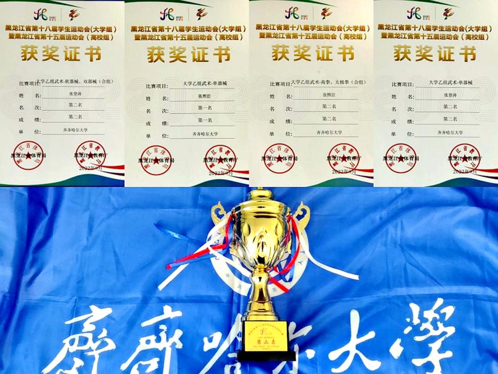 本次賽事為期3天,共有來自黑龍江省20所高等院校的210名運動員和教練員參與了此次大型賽事。比賽中,我校武術隊隊員在體育學院鮑宇老師的帶領下,以武會友、頑強拼搏,不畏強敵、敢打敢拼,充分展現出了良好的體育競技水平和我校學子奮勇爭先、蓬勃向上的精神面貌。體育學院張熙臣同學獲得一枚金牌一銀牌,張登濤同學獲得兩枚銀牌。同時,鮑宇老師被評為優秀裁判員,三名隊員被評為優秀運動員。
