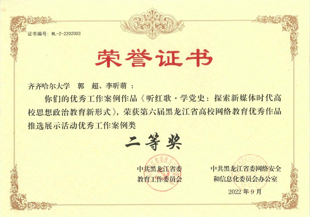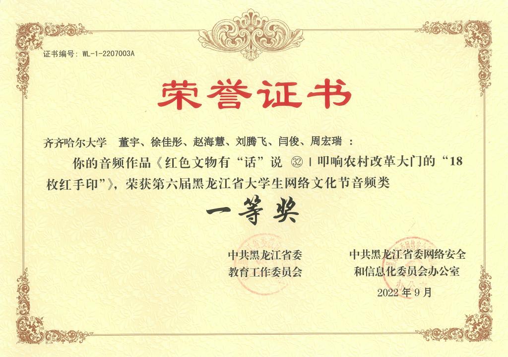 我校25項作品在第六屆“全省大學生網絡文化節”獲獎,分別是一等獎1項,二等獎6項,三等獎18項。其中,由播主202董宇、制藥201徐佳彤、工管202趙海慧、環藝201劉騰飛、計應202閆俊、機械201周宏瑞等六名同學錄制的音頻作品《紅色文物有話說丨扣響農村改革大門的“18枚紅手印”》獲全省一等獎;由宣傳部郭超、李昕萌老師提交的作品《聽紅歌· 學黨史:探索新媒體時代高校思想政治教育新形勢》獲得“全省高校網絡教育優秀作品推選展示活動”優秀工作案例二等獎。獲獎作品數量和質量較前幾屆均有新的突破,充分展現我校在繁榮網絡文化、推進高校網絡思政育人工作上取得的成效。