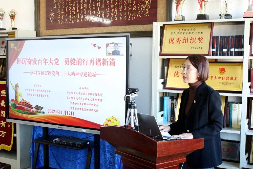 為深入學習宣傳貫徹黨的二十大精神,進一步加深全體師生對黨的二十大精神的理解和把握,11月12日下午,由學校黨委宣傳部、齊齊哈爾市社會科學界聯合會共同主辦,經濟與管理學院黨委與馬克思主義學院黨委、齊齊哈爾市管理科學研究會、齊齊哈爾市教育教學研究院共同承辦的學習宣傳貫徹黨的二十大精神專題論壇在逸夫樓1304會議室成功舉行。