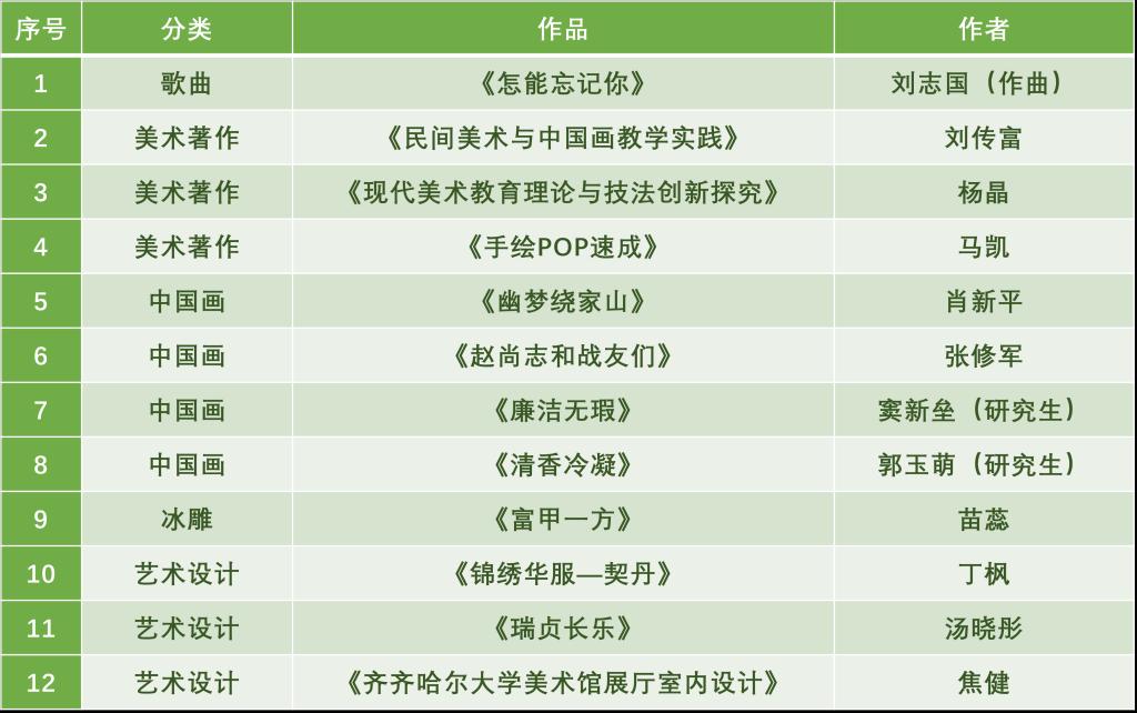 日前,齊齊哈爾市文學藝術界聯合會對第六屆齊齊哈爾文藝獎獲獎名單進行了公示。我校5名教師及14件文藝作品獲獎。具體名單如下: