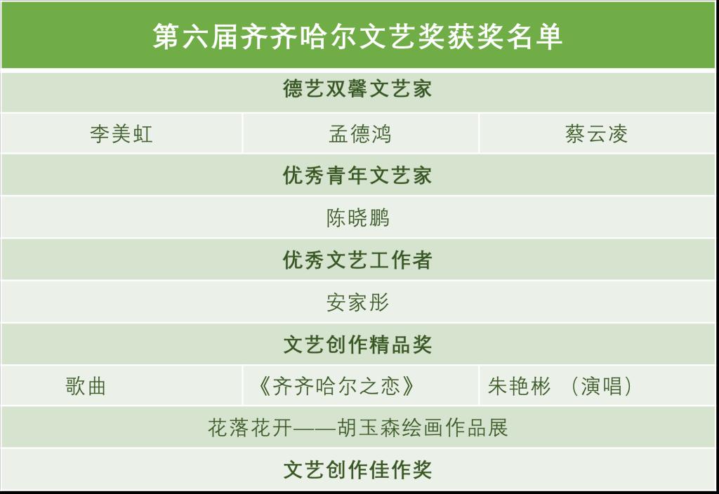 據了解,按照《關于第六屆齊齊哈爾文藝獎評選工作的通知》規定程序,經過嚴肅認真、公平公正、科學規范的工作,本屆文藝獎共評選出德藝雙馨文藝家8人,優秀青年文藝家3人,優秀文藝工作者73人,文藝創作精品獎13件,文藝創作佳作獎63件。