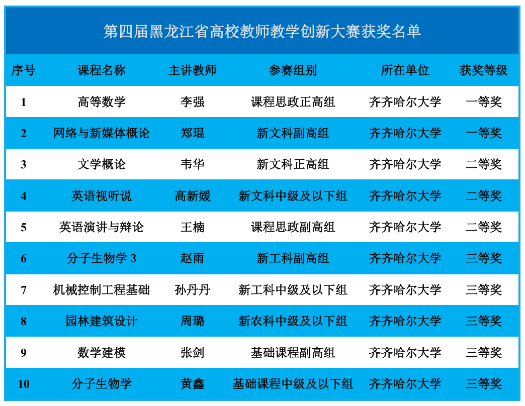 4月27日,由省教育廳主辦的第四屆黑龍江省高校教師教學創新大賽在哈爾濱工程大學落下帷幕。經過激烈角逐,我校2門課程獲一等獎,3門課程獲二等獎,5門課程獲三等獎。