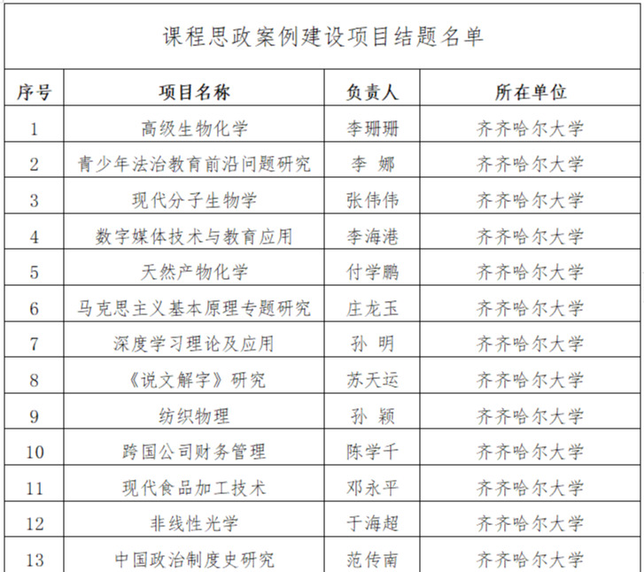 發(fā)布日期:2024-05-31 點(diǎn)擊量:近日,黑龍江省教育廳下發(fā)了《關(guān)于公布2023 年度黑龍江省研究生課程思政建設(shè)項(xiàng)目結(jié)題名單的通知》(黑教研函〔2024〕48號(hào))。我校共有15個(gè)項(xiàng)目通過(guò)結(jié)題驗(yàn)收。