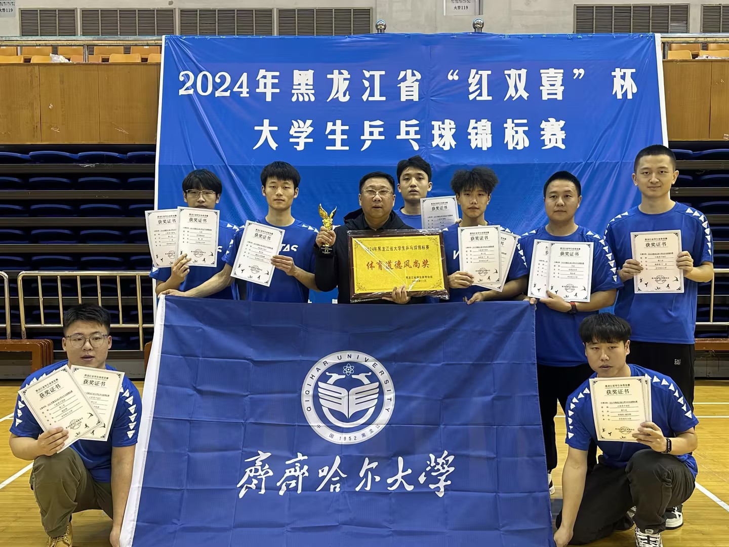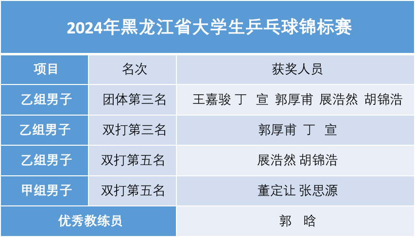 10月15日至17日,由黑龍江省學(xué)生體育協(xié)會主辦、黑龍江大學(xué)承辦、黑龍江省學(xué)生體育聯(lián)合會乒乓球分會協(xié)辦的2024年黑龍江省大學(xué)生乒乓球錦標(biāo)賽在黑龍江大學(xué)體育館拉開帷幕。我校兩支乒乓球隊(duì)參賽,經(jīng)過激烈的角逐,最終獲得體育專業(yè)組乙組團(tuán)體季軍、乙組男子雙打季軍、乙組男子雙打第五名、甲組男子雙打第五名優(yōu)異成績,指導(dǎo)教師郭晗獲優(yōu)秀教練員稱號。