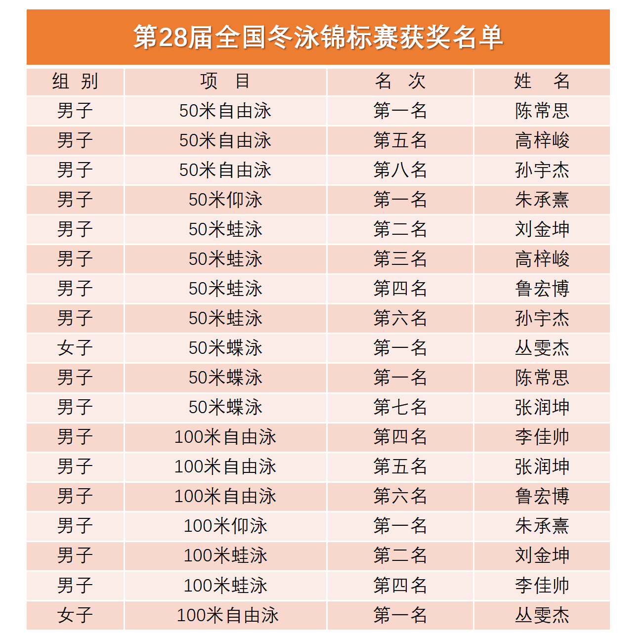 11月9至10日,由國家體育總局游泳運動管理中心、中國游泳協(xié)會主辦,牡丹江市人民政府承辦的第28屆全國冬泳錦標(biāo)賽在牡丹江市鏡泊湖吊水樓瀑布景區(qū)的黑龍?zhí)杜e行,本次比賽吸引了來自全國18個省市的31支代表隊近700名運動員參賽。我校游泳隊在本次全國級別的賽事中取得歷史性突破,共獲得單項6個第一名、2個第二名、1個第三名,以及青年組團體總分第一名的優(yōu)異成績。