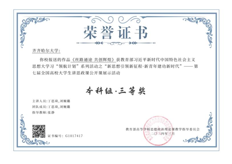 近日,由教育部高校思政課教學指導委員會主辦,南開大學馬克思主義學院承辦的“新思想引領新征程?新青年建功新時代”——第七屆全國高校大學生講思政課公開課展示活動公布了評審結果。我校馬克思主義學院張靜教授指導的學生參賽作品《絲路通途 共創輝煌》榮獲本科組三等獎。