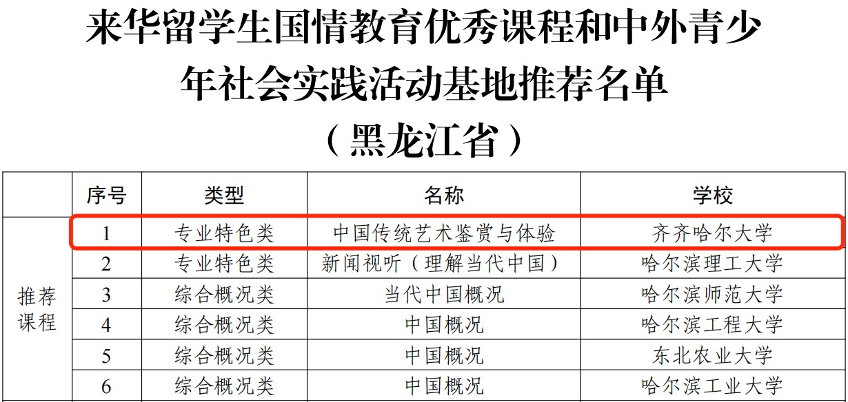 近日,中國教育國際交流協會公布首批“來華留學生國情教育優秀課程和中外青少年社會實踐活動基地”推薦名單,我?!吨袊鴤鹘y藝術鑒賞與體驗》獲批專業特色類優秀課程,成為全國首批來華留學生國情教育優秀課程之一。