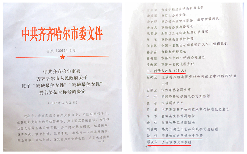 3月7日下午,齊齊哈爾市婦聯在市工人文化宮舉辦了慶祝建會70周年暨“鶴城最美女性”頒獎典禮,我校財務處處長沙偉和材料科學與工程學院教授顧曉華榮獲“鶴城最美女性”稱號。