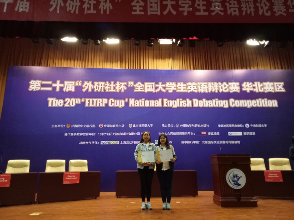 為了進一步豐富大學生校園文化,引導和幫助學生強化英語學習意識、培養國際眼光、提高獨立思考、語言表達、組織協調能力,4月2日至4月4日第二十屆“外研社杯”全國大學生英語辯論賽華北地區決賽在中央財經大學舉行,在學校和學院領導的大力支持下,我校外國語學院英語專業學生陳煒、陳彥宇代表我校參加了本次比賽并榮獲三等獎,外國語學院英語系孫舒老師被評為“優秀評委”。