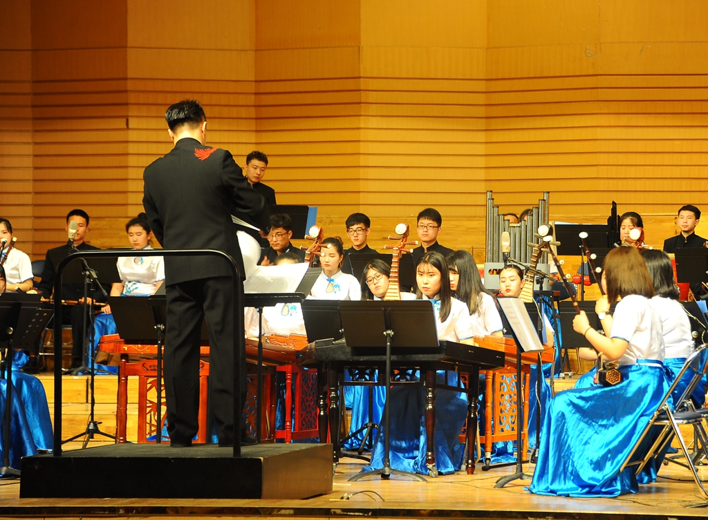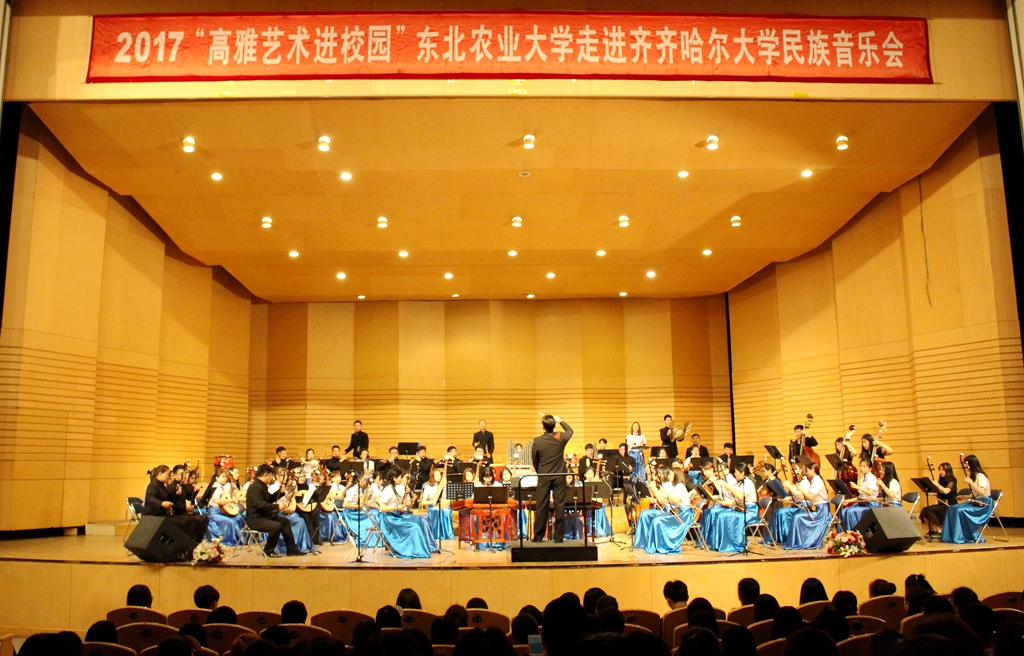 5月16日晚,2017“高雅藝術進校園”——東北農業大學民族器樂專場音樂會在我校音樂廳隆重奏響。來自東北農業大學藝術學院青年民族管弦樂團的60余名師生用他們的精湛技藝為我校師生送來一場高水平的音樂盛宴。我校黨委副書記齊宏偉,學校辦公室主任張德慶,黨委宣傳統戰部部長王曉梅,學生工作部(學生處)部(處)長姜波,黨委宣傳統戰部副部長何強,音樂與舞蹈學院黨政班子全體和1000余名師生共同欣賞了演出。東北農業大學藝術學院副院長于洋等領導一起觀看了演出。