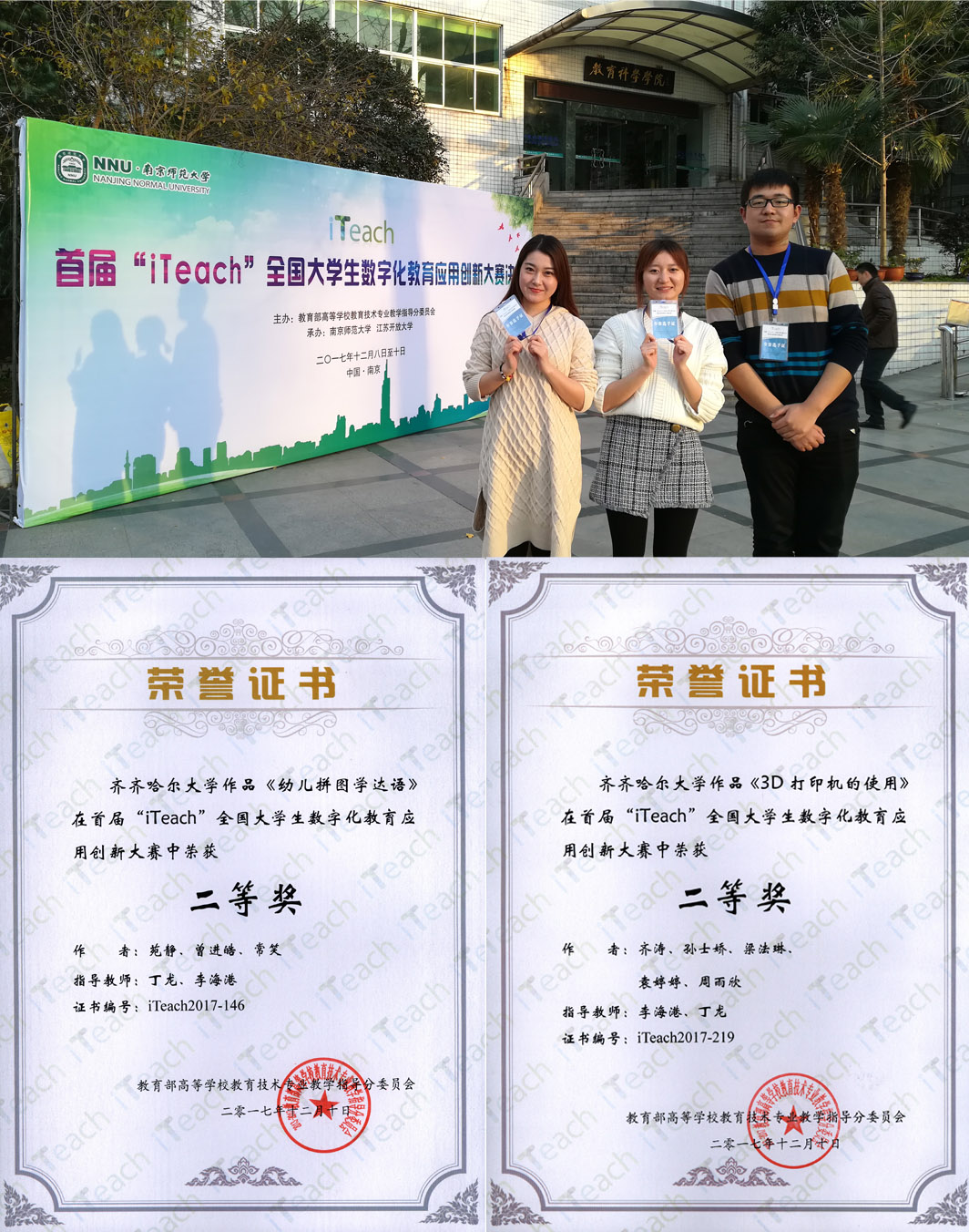 12月9-10日,由高等學(xué)校教育技術(shù)教學(xué)指導(dǎo)分委員會主辦,南京師范大學(xué)與江蘇開放大學(xué)共同承辦的“iTeach”全國大學(xué)生2017(首屆)數(shù)字化教育應(yīng)用創(chuàng)新大賽在南京師范大學(xué)落下帷幕,我校兩件作品喜獲二等獎。