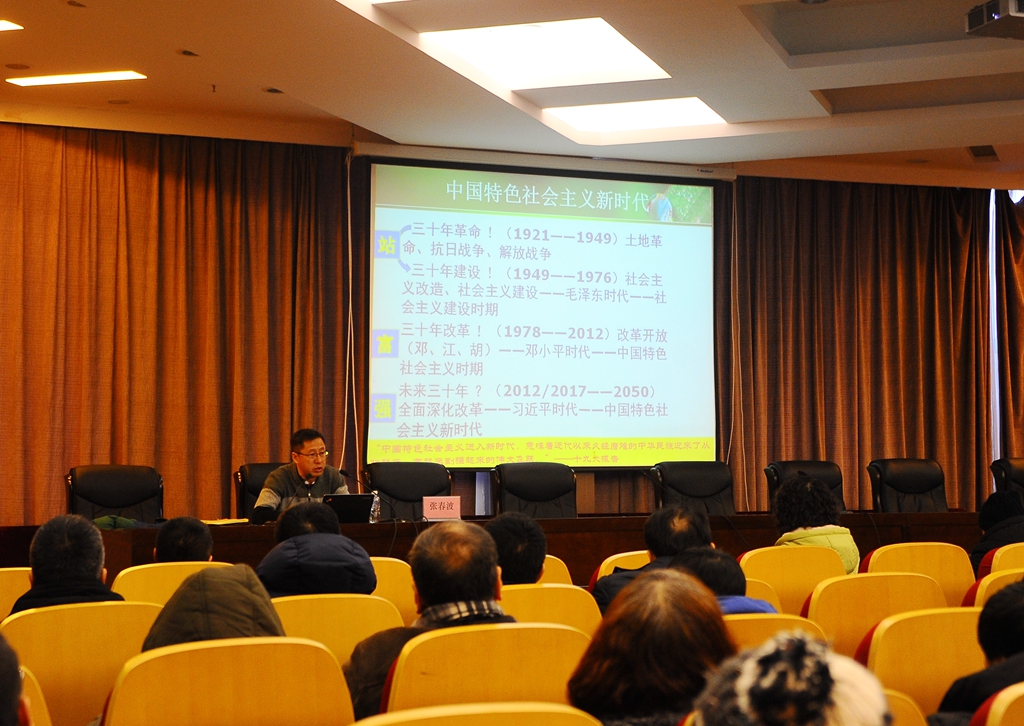 校黨的十九大精神宣講團成員、馬克思主義學院中國近現代史基本問題教研部主任張春波副教授作了題為《新思想引領新時代 新使命開啟新征程》的專題報告,在報告中,他從“新時代、新矛盾——進行偉大斗爭”、“新理論、新思想——建設偉大工程”、“新任務、新舉措——推進偉大事業”和“新使命、新征程——實現偉大夢想”等四個方面對黨的十九大精神做了深入的解讀。