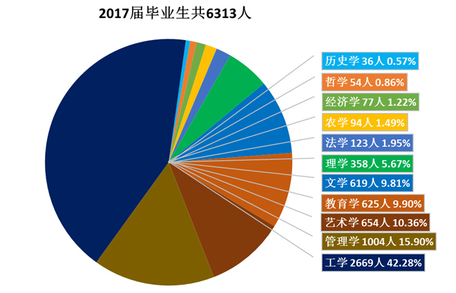 我校2017屆畢業生就業基本情況。2017屆本科畢業生共計6313人,其中男生2907人,占比46.05%。女生3406人,占比53.95%。男女生之比為0.85:1。涵蓋工學等11個學科門類,生源分布以黑龍江省為主,包括31個省(自治區、直轄市)。我校2017屆畢業生的初次就業率為90.1%,年終就業率為94.0%,初期就業率相比去年同期上升了2.36個百分點。2017屆畢業生的就業結構是簽約就業、升學、出國、靈活就業和待就業。就業行業主要為教育、信息技術、制造業、科學研究為主。