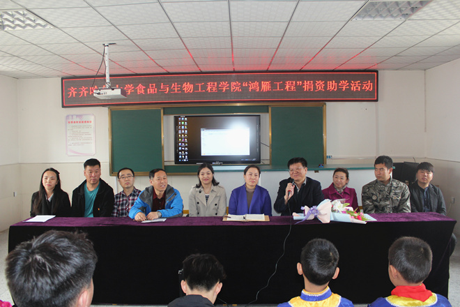 最后,校團委書記蘇醒做了總結講話。她談到:今天是懷著激動的心情參加“鴻雁工程”捐資助學活動的,“鴻雁工程”的“大手”和“小手”的故事,在每一個齊大人心中是一個傳說,我們每個人都知道“鴻雁工程”所承載的是“大手”與“小手”共同成長,共同進步的故事,“小手”們期盼的目光、傾注的真誠,增強了“大手”們的社會責任感、使命和擔當,讓他們在邁向社會后能夠成為一個有用之才。而在“大手”們真摯的關懷和拉動下,“小手”們對大學生活充滿了幻想與渴望。這是我們承載的有關“鴻雁工程”活動最希望達到的一個目的,也許孩子們未來的生活、理想,會比我們齊齊哈爾大學的志愿者們更加高遠,但這個起點是由我們帶給孩子們的,所以我們要感謝“鴻雁工程”,感謝我們的“大手”和“小手”共同付出的辛勤和勞動。同時有一個好消息傳來,前不久2017年五四紅旗先進集體獎在我們共同的努力下也收入到“鴻雁工程”的囊中,這對我們的工作是一個莫大的鼓舞,也是激勵我們下一步更好的發展這項工作,更好的傳承“鴻雁工程”的一個力量源泉。由此她號召所有的“大手”和“小手”,共同努力把“鴻雁工程”活動做得更好,讓它從20年到30年再到40年,就像今天種下的果樹一樣,碩果累累,亙古長青。