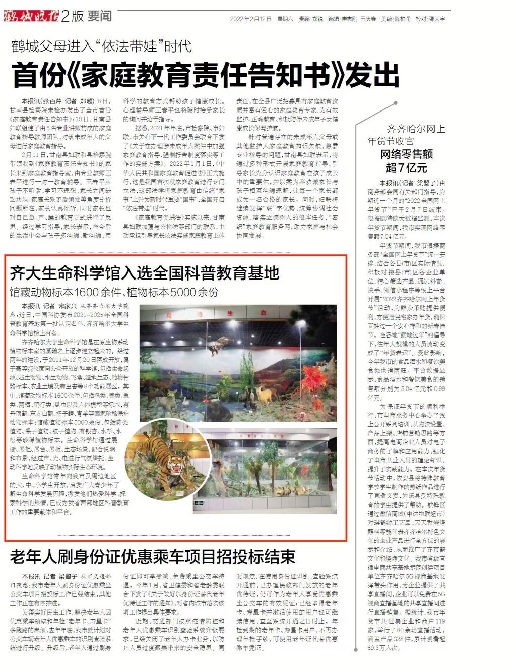 下一條:【齊齊哈爾日報】齊齊哈爾大學生命科學館入選全國科普教育基地