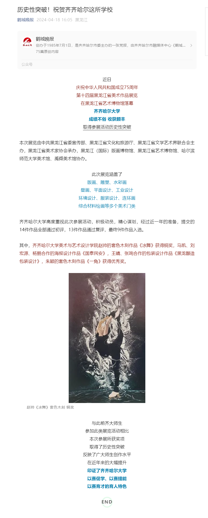 上一條:【齊齊哈爾新聞網】第十四屆黑龍江省美術作品展覽齊齊哈爾大學《冰舞》獲銅獎