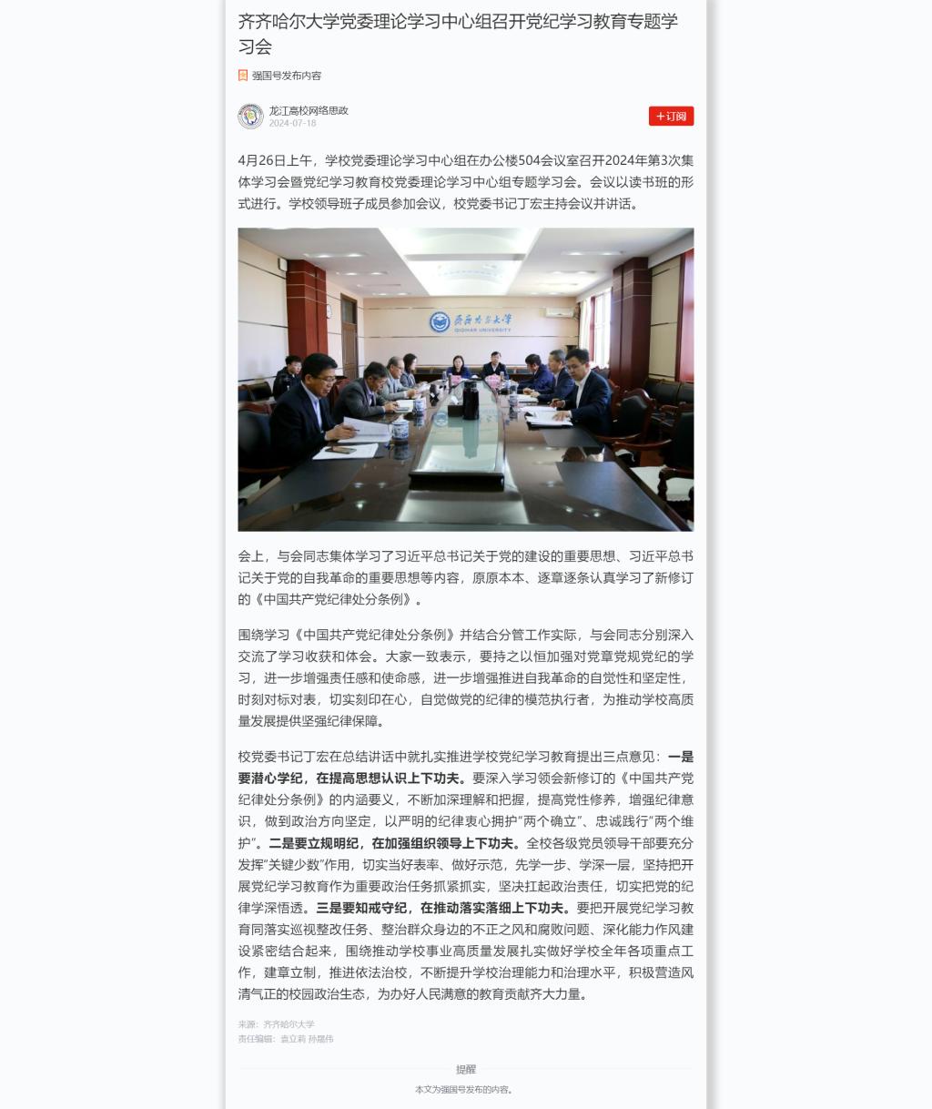 上一條:【全國高校思想政治工作網(wǎng)】齊齊哈爾大學(xué):堅(jiān)持“四個(gè)結(jié)合”,持續(xù)推動(dòng)黨紀(jì)學(xué)習(xí)教育走心走實(shí)走深